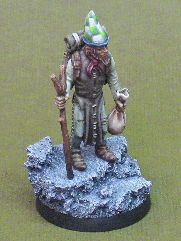 The conical (comical?) hat featured on this mini seemed a good place to play around with some freehand painting. I first removed the prominent stitching detail to provide a clear area to work on. It took two attempts but I wound up with a pattern that mirrors the shield borne by the camera-shy mule.